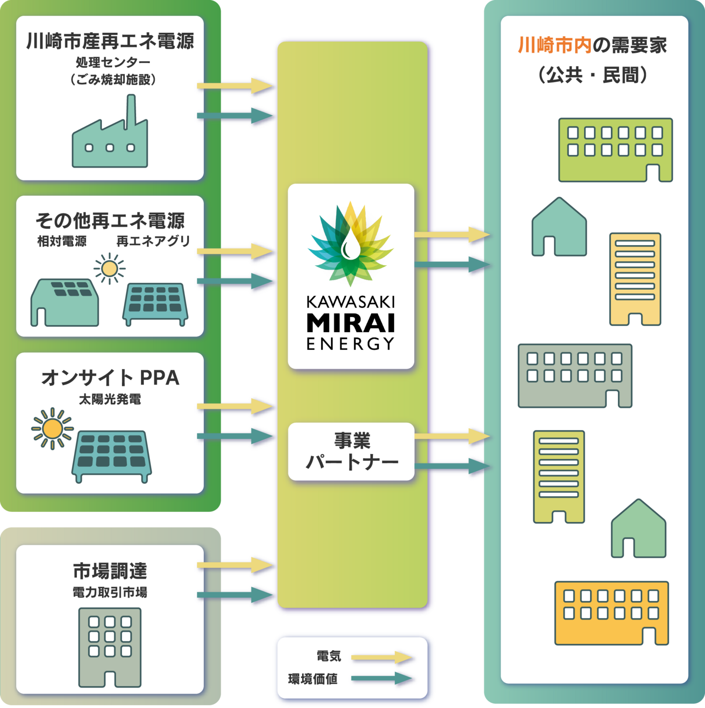 市域の温室効果ガス削減に資するため、再エネ電力を調達し、供給することで、市域への再エネ普及・地産地消を推進するとともに、市民、事業者、金融機関等の多様なステークホルダーが参画できる地域エネルギープラットフォームの中核となることを目的とした地域エネルギー会社